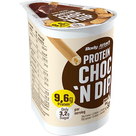 Body Attack Protein Choc N Dip هي وجبة خفيفة مريحة تركز على البروتين ومصممة للاستهلاك أثناء التنقل. يتميز بكريمة الكاكاو بالبندق مع 13 قطعة خبز مقرمشة للتغميس. هذه الوجبة الخفيفة مناسبة لمختلف الأماكن، بما في ذلك السينما، أو الأحداث المفتوحة، أو المكتب، أو أثناء الأنشطة الرياضية. يمكن وضع صندوق الوجبات الخفيفة المدمج بسهولة في حقائب اليد والحقائب الرياضية، مما يجعله بديلاً عمليًا لألواح البروتين التقليدية أو المواد القابلة للدهن.
