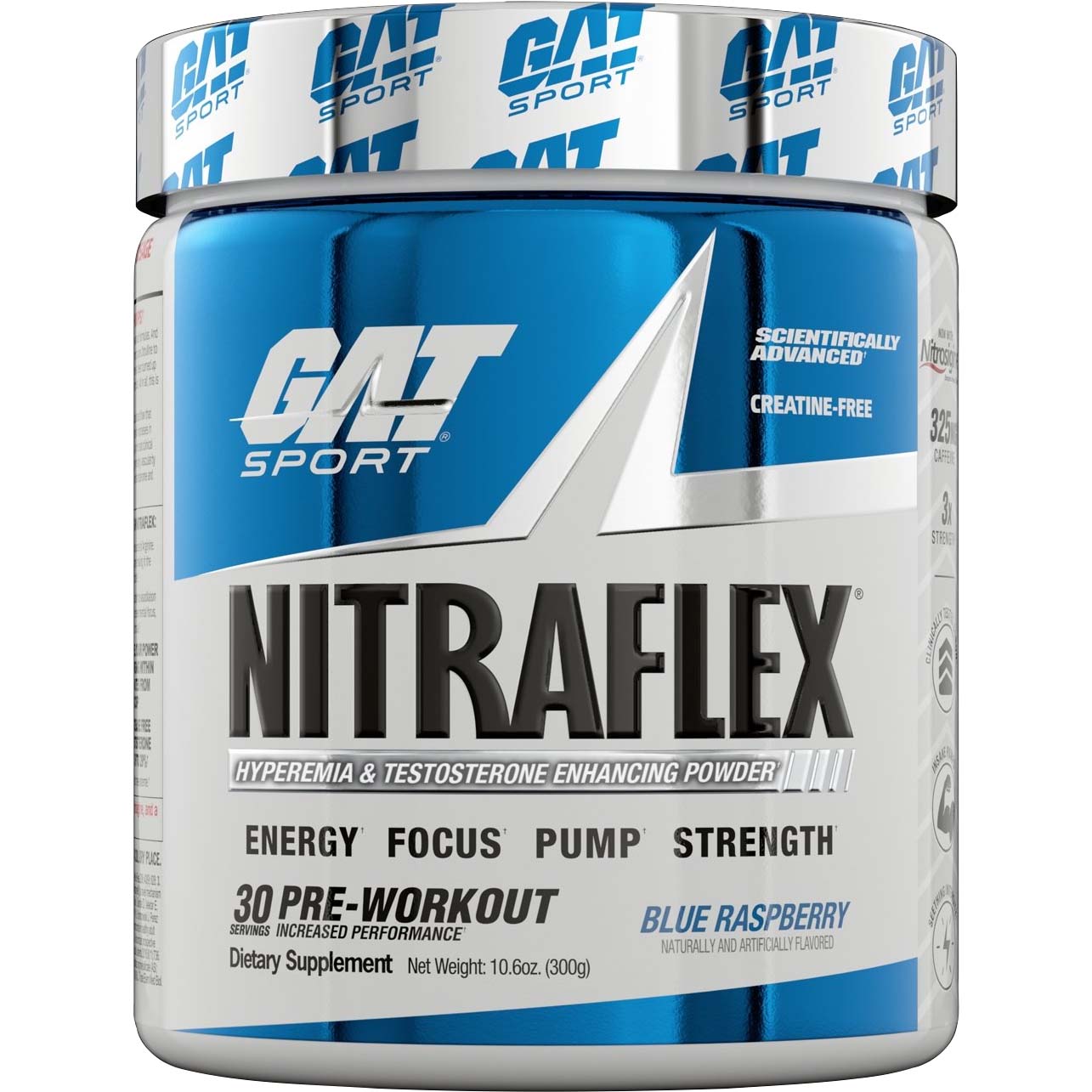 GAT Sport Nitraflex Testosterone Boosting Powder بنكهة التوت الأزرق عبارة عن تركيبة تدريب مسبقة تم اختبارها سريريًا ومصممة لتعزيز الطاقة واليقظة والقوة والقدرة على التحمل والمضخات ومستويات هرمون التستوستيرون المجانية أثناء التدريبات. تم تصميم هذا المنتج لتقديم نتائج تدريب سريعة ومتفجرة، ودعم الطاقة والقدرة على التحمل وإنتاج أكسيد النيتريك (NO) ومستويات هرمون التستوستيرون.