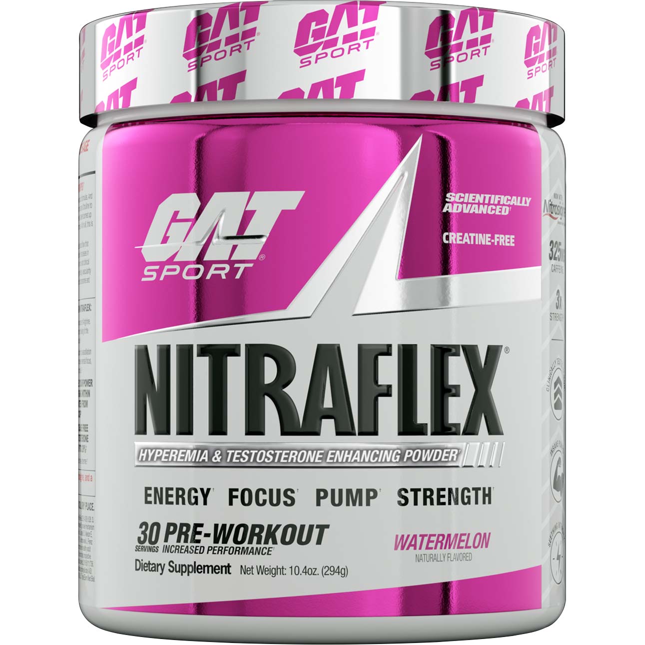 GAT Sport Nitraflex Testosterone Boosting Powder بنكهة البطيخ عبارة عن تركيبة تدريب مسبقة عالية الكثافة تم اختبارها سريريًا ومصممة لتعزيز الطاقة واليقظة والقوة والقدرة على التحمل والمضخات والتستوستيرون الحر أثناء التدريبات. يقدم مكمل ما قبل التمرين هذا نتائج تدريب سريعة ومتفجرة، ويدعم الطاقة والقدرة على التحمل وإنتاج أكسيد النيتريك (NO) ومستويات هرمون التستوستيرون.