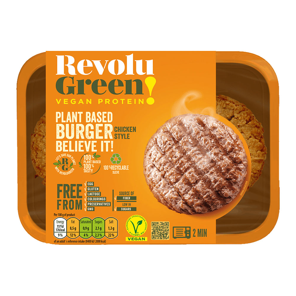 إن Revolu Green Burger خالي أيضًا من الكائنات المعدلة وراثيًا (GMOs)، بما يتماشى مع تفضيلات المستهلكين الذين يبحثون عن منتجات غير معدلة وراثيًا. تساهم تركيبتها النباتية في تقليل البصمة البيئية مقارنة بمنتجات اللحوم التقليدية، مما يجعلها جذابة للمستهلكين المهتمين بالبيئة.