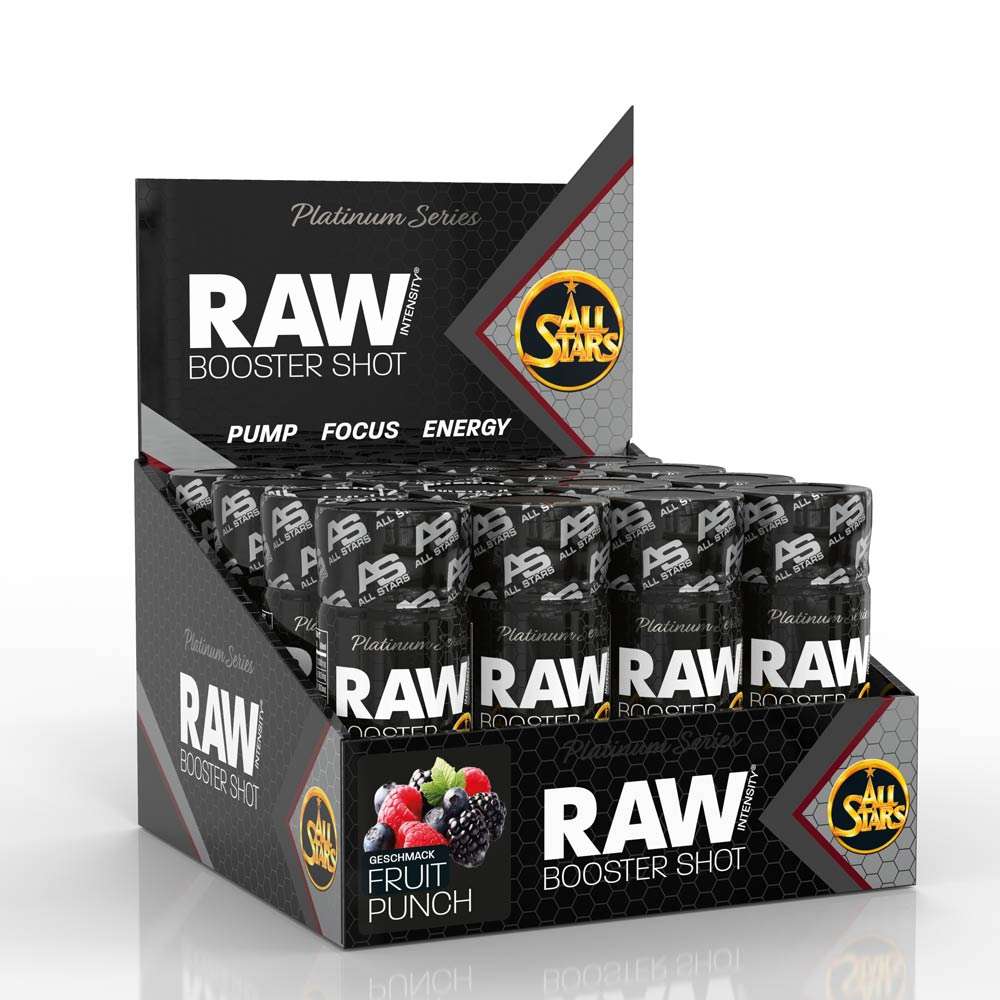 All Stars Raw Booster Shots، Fruit Punch، صندوق مكون من 12 طلقة، يوفر دفعة مكثفة من الطاقة قبل التدريبات لتحقيق أقصى قدر من الكثافة. كل جرعة سعة 60 مل جاهزة للشرب وتتميز بمصفوفة طاقة RAW، المصممة لتعزيز الضخ والطاقة والتركيز أثناء التدريب. يضمن الشكل السائل امتصاصًا سريعًا للمكونات.