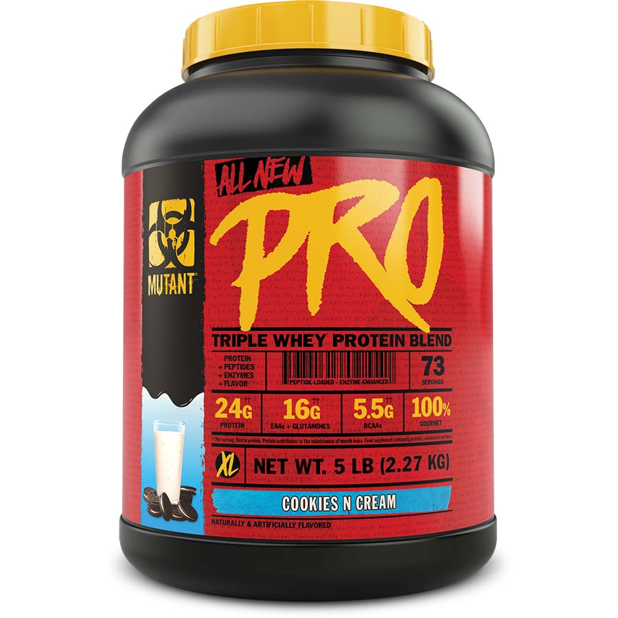Mutant New Look Pro Triple Whey, Cookies and Cream، 5 رطل، هو مكمل بروتين متطور مصمم لتعزيز أداء التمرين ونمو العضلات. توفر كل ملعقة 24 جرامًا من بروتين مصل اللبن النقي بنسبة 100%، مصدره ثلاثة أنواع حيوية من بروتين مصل اللبن. يضمن هذا المزيج مراحل سريعة ومتأخرة وممتدة من امتصاص الأحماض الأمينية، مما يحسن تعافي العضلات ونموها.