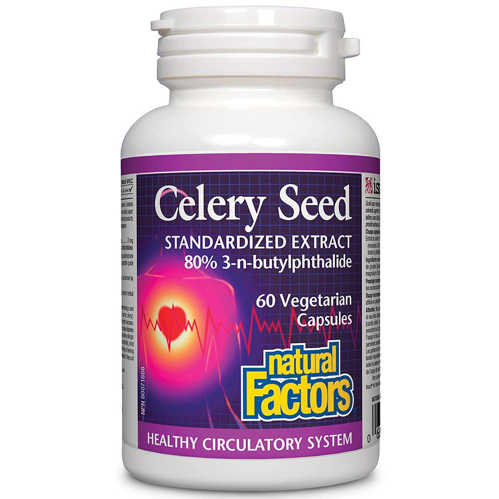 Natural Factors Celery Seed Standard Extract هو مكمل غذائي مصمم لدعم مختلف جوانب الصحة. تحتوي كل زجاجة على 60 كبسولة نباتية، حيث توفر كل كبسولة خلاصة موحدة من بذور الكرفس. تم توحيد المستخلص بنسبة 85%، مما يضمن قوة وفعالية متسقة.