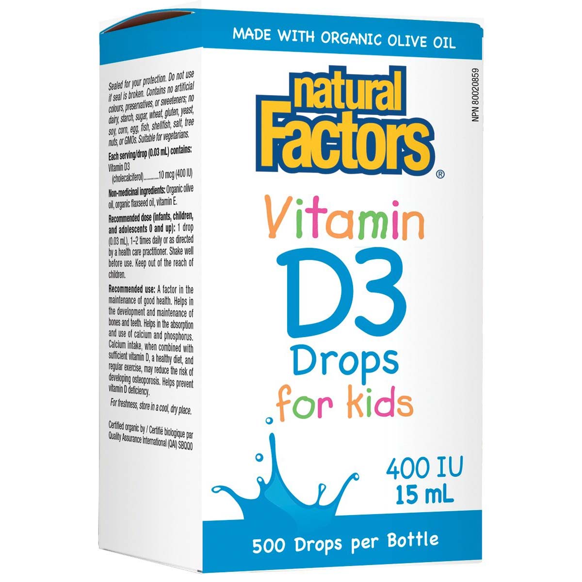 قطرات فيتامين د3 للأطفال من ناتشورال فاكتورز، 400 وحدة دولية، 15 مل، توفر فيتامين د3 الأساسي الضروري لنمو الأطفال وصحة العظام. يدعم هذا المنتج نمو وتقوية العظام والأسنان، مما يساعد على الوقاية من حالات مثل الكساح ولين العظام. يلعب فيتامين د3 دورًا حاسمًا في تنظيم مستويات الكالسيوم في الجسم، وهو أمر حيوي للحفاظ على صحة العظام والأسنان.