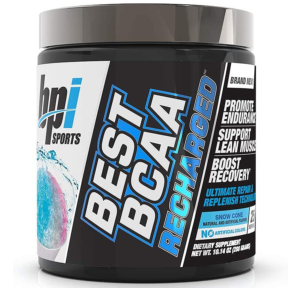 BPI Sports Best BCAA Recharged, Snow Cone, 25 servings, is an advanced version of the original Best BCAA formula. This product includes the essential branchedchain amino acids (BCAAs) leucine, isoleucine, and valine, which support lean muscle growth, prevent muscle breakdown, and optimize muscle recovery. Additionally, it contains green tea, taurine, coconut water, electrolytes, and the patented ingredient Peak O2.