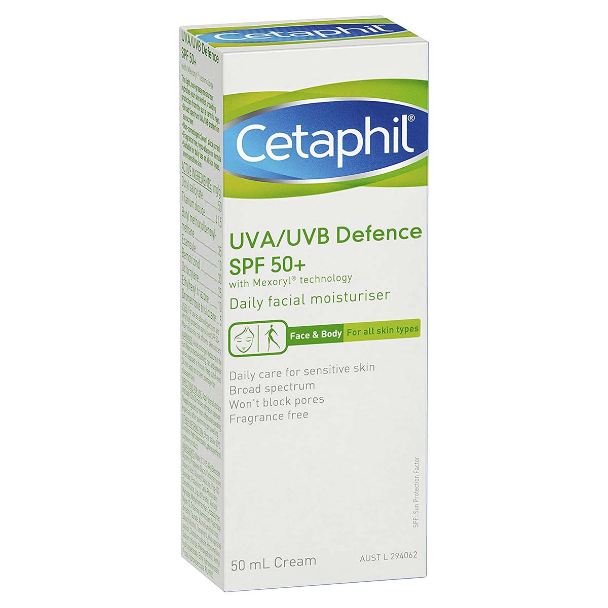 Cetaphil UVA/UVB Sun Defense SPF50+ is a high SPF facial moisturizer designed to protect against sunburn and premature skin aging. This product is lightweight and nonirritating, making it suitable for daily use. It is easily absorbed by the skin, leaving no white deposits or greasy residue. The formulation includes an optimum blend of UV filters, providing broadspectrum UVA/UVB protection.