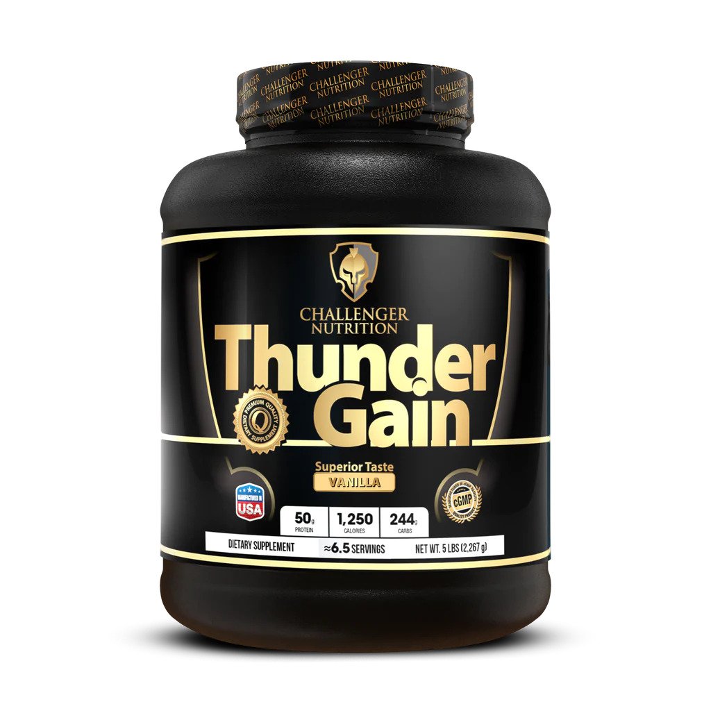 Challenger Nutrition Thunder Gain, Vanilla Ice Cream, 5 LB, is designed for serious athletes and bodybuilders aiming to gain weight efficiently. Each 334gram serving delivers 1,250 calories, making it a highcalorie option for those looking to increase muscle mass. The product contains pure whey protein concentrate, providing 50 grams of protein per serving. Essential nutrients such as calcium, iron, and potassium are also included to support overall health.