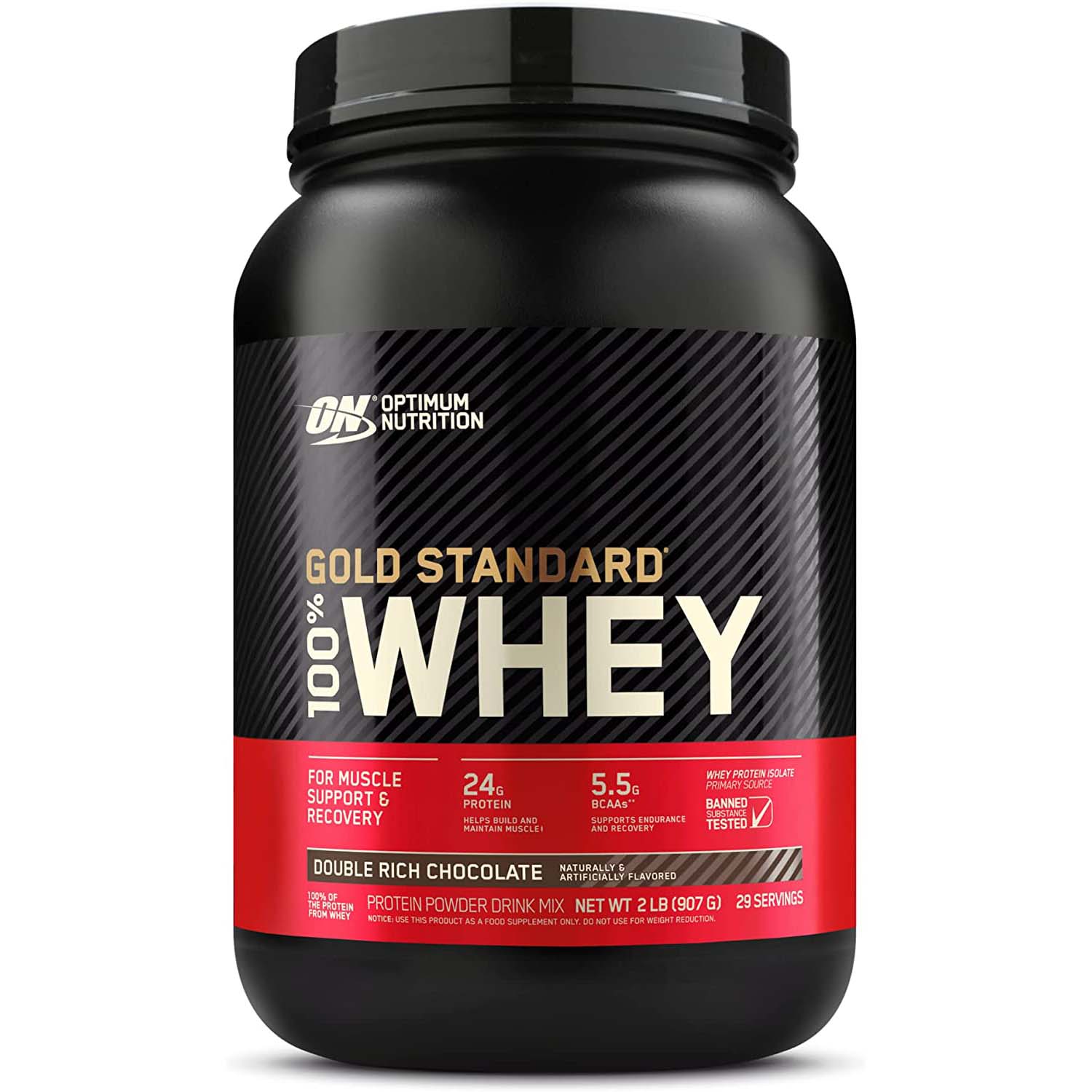 Optimum Nutrition Gold Standard 100% Whey Protein in Double Rich Chocolate flavor is a highquality protein supplement designed to support muscle building and recovery. This 2 LB container features whey protein isolate as its primary source, one of the purest forms of protein available. Each serving provides essential amino acids, including the three branchedchain amino acids (BCAAs): leucine, isoleucine, and valine, which are crucial for muscle repair and growth.