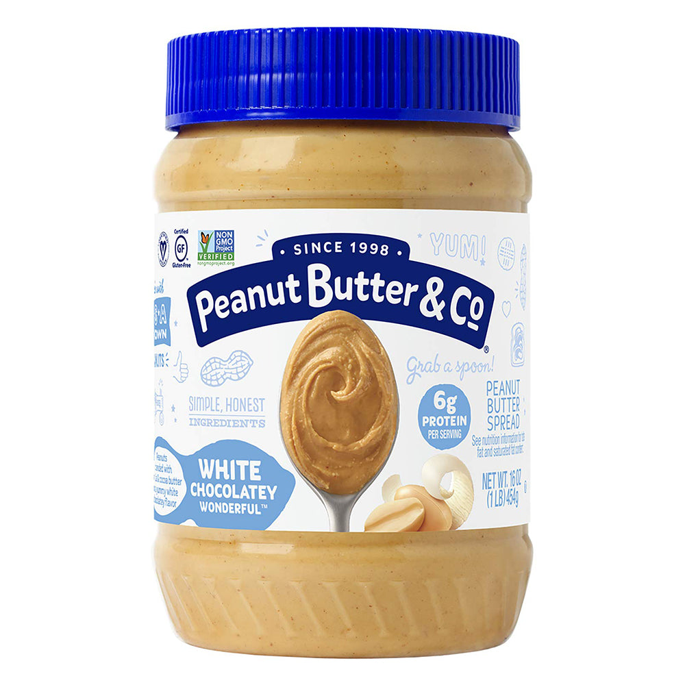 Peanut Butter & Co. Peanut Butter, White Chocolate Wonderful, 1LB, is a popular peanut butter product. It is made with peanuts, a pinch of salt, and a touch of cane sugar. Palm oil is added to prevent the peanut oil from separating, eliminating the need for stirring.