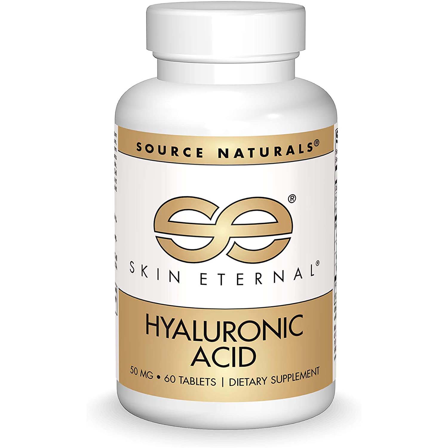 Source Naturals Skin Eternal Hyaluronic Acid provides 50 mg of hyaluronic acid per tablet, with a total of 60 tablets per bottle. Hyaluronic acid and collagen are essential components of skin structure that decrease with age. This product is formulated to help maintain skin hydration and support joint function.