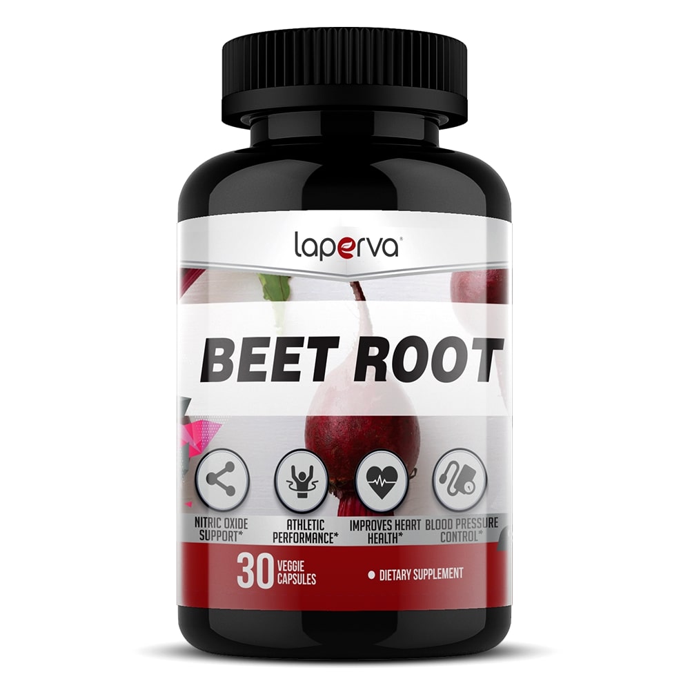 Laperva Beetroot, 30 Veggie Capsules, 650 mg, is a dietary supplement designed to support various bodily functions. Each capsule contains 650 mg of organic beetroot, rich in nitrates, betaine, fiber, minerals, and vitamins. The nitrates in beetroot are converted by the body into nitric oxide, which helps expand blood vessels, facilitating efficient oxygen and nutrient transport. This supports cardiovascular health, blood pressure control, and athletic performance.
