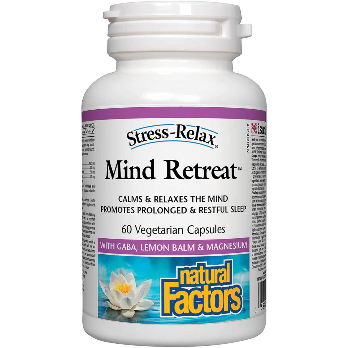 Natural Factors Mind Retreat promotes feelings of calm and relaxed alertness, strengthens mental clarity, and helps relieve insomnia during times of distress. It supports improved sleep quality and helps manage occasional stress. The natural GABA in the formula is superior to synthetic alternatives, providing additional support during acute stress.