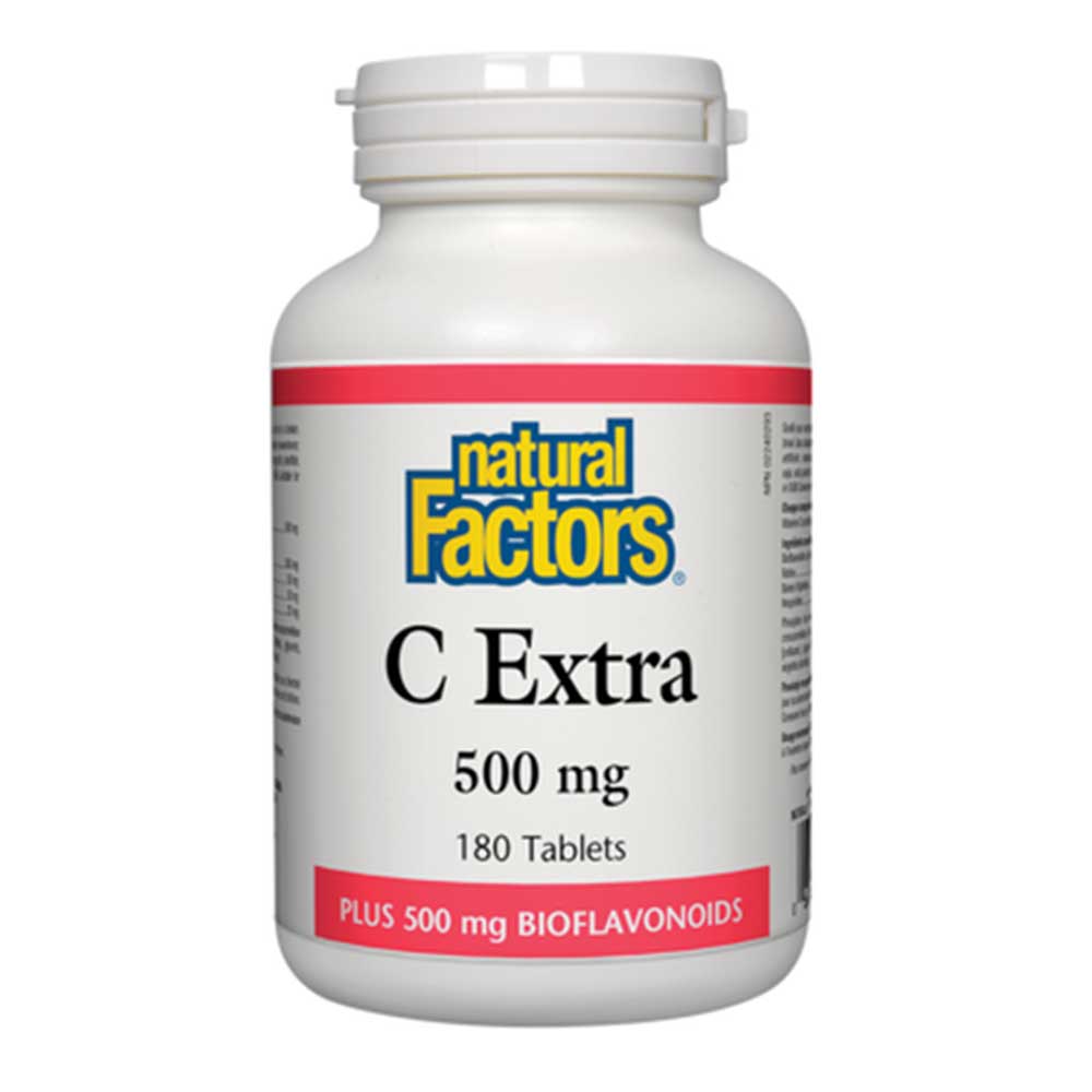Natural Factors Vitamin C Extra provides 500 mg of vitamin C per tablet, combined with additional antioxidants like citrus bioflavonoids, rutin, rosehips, and hesperidin. This product supports immune function and acts as an antioxidant, helping to protect against free radicals. It plays a role in the development and maintenance of bones, cartilage, teeth, and gums. Additionally, it aids in wound healing and connective tissue formation. The formula also helps maintain the body's ability to metabolize nutrients. Each bottle contains 180 tablets, offering a convenient and longlasting supply.