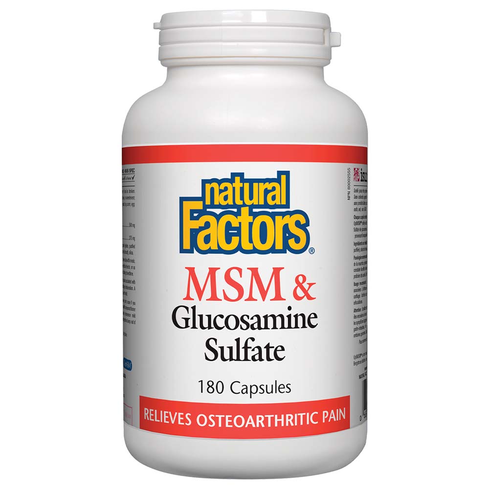 Natural Factors MSM & Glucosamine Sulfate, 180 Capsules, is designed to support joint health and alleviate joint pain associated with osteoarthritis. This supplement combines two key nutrients: MSM (Methylsulfonylmethane) and Glucosamine Sulfate. These ingredients are essential for the formation of connective tissue, which is crucial for maintaining healthy joints and muscles.