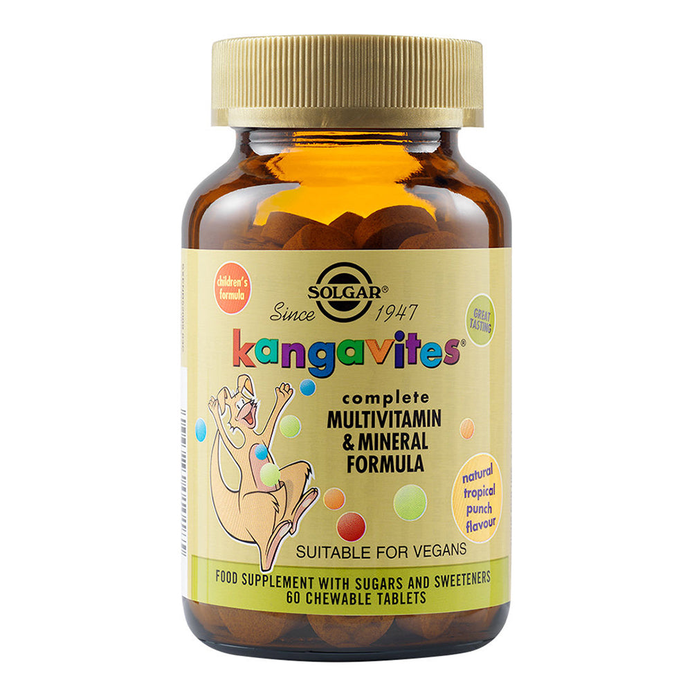 Solgar Kangavites Complete Multivitamin and Mineral, 60 Chewable Tablets, Tropical Punch, is a dietary supplement designed for children. This product provides essential vitamins and minerals to support growth and development. It also helps strengthen the immune system. Each serving contains only 1 gram of sugar, making it a lowsugar option for children's nutrition.