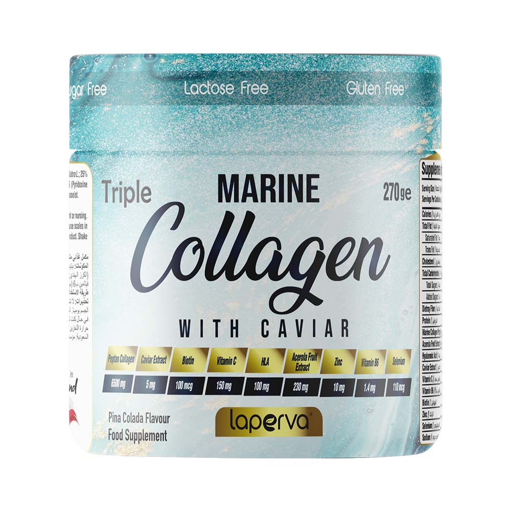 Laperva Triple Marine Collagen with Caviar, Pina Colada, 270 Gm is a dietary supplement designed to support skin health and reduce signs of aging. The formula includes hydrolyzed marine collagen, active caviar extract, biotin, and essential vitamins and minerals.